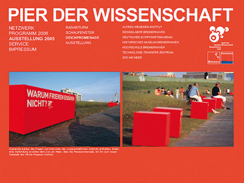 Das Faltblatt ist das Begleitmedium zum Informations- und Leitsystem und kann von den Besuchern im Foyer des Radarturms mitgenommen werden. Die Vorderseite gibt einen Einblick in die Themen der Ausstellung und die Institute. Aufgeklappt werden die inhaltlichen Relationen zwischen Themen und Instituten sichtbar. Die Rückseite zeigt in einer Karte die verschiedenen Veranstaltungsorte, wie das Leitsystem, die Ausstellung und die Schaufenster. Zusätzlich wird über die diversen Veranstaltungen rund um die Pier der Wissenschaft informiert.